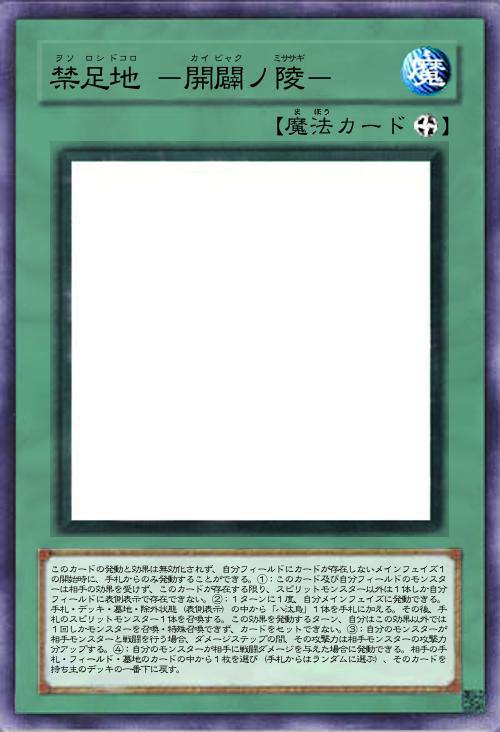 | このカードの発動と効果は無効化されず、自分フィールドにカードが存在しないメインフェイズ1の開始時に、手札からのみ発動することができる。①:このカード及び自分フィールドのモンスターは相手の効果を受けず、このカードが存在する限り、スピリットモンスター以外は1体しか自分フィールドに表側表示で存在できない。②:1ターンに1度、自分メインフェイズに発動できる。手札・デッキ・墓地・除外状態(表側表示)の中から「八汰烏」1体を手札に加える。その後、手札のスピリットモンスター1体を召喚する。この効果を発動するターン、自分はこの効果以外では1回しかモンスターを召喚・特殊召喚できず、カードをセットできない。③:自分のモンスターが相手モンスターと戦闘を行う場合、ダメージステップの間、その攻撃力は相手モンスターの攻撃力分アップする。④:自分のモンスターが相手に戦闘ダメージを与えた場合に発動できる。相手の手札・フィールド・墓地のカードの中から1枚を選び(手札からはランダムに選ぶ)、そのカードを持ち主のデッキの一番下に戻す。 | |||