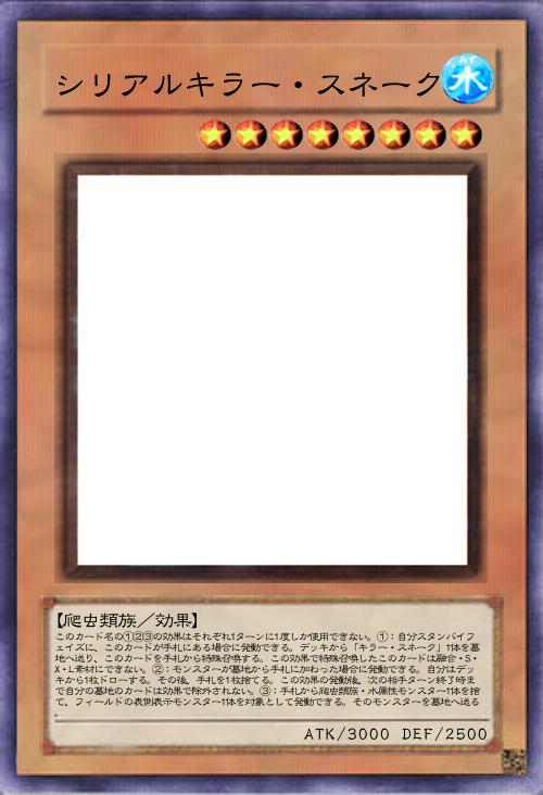 | このカード名の①②③の効果はそれぞれ1ターンに1度しか使用できない。①:自分スタンバイフェイズに、このカードが手札にある場合に発動できる。デッキから「キラー・スネーク」1体を墓地へ送り、このカードを手札から特殊召喚する。この効果で特殊召喚したこのカードは融合・S・X・L素材にできない。②:モンスターが墓地から手札に加わった場合に発動できる。自分はデッキから1枚ドローする。その後、手札を1枚捨てる。この効果の発動後、次の相手ターン終了時まで自分の墓地のカードは効果で除外されない。③:手札から爬虫類族・水属性モンスター1体を捨て、フィールドの表側表示モンスター1体を対象として発動できる。そのモンスターを墓地へ送る。 | |||