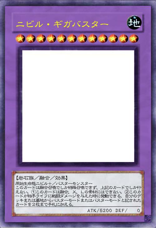 | 原始生命態ニビル+/バスターモンスター このカードは融合召喚でしか特殊召喚できず、上記のカードでしか行えない。①このカードは融合、X、Lの素材にはできない。②このカードが相手ライフに戦闘ダメージを与えた時に発動できる。自分のデッキまたは墓地からバスターモードまたはバスターモードと記されたカードを2枚まで手札に加える。 | |||