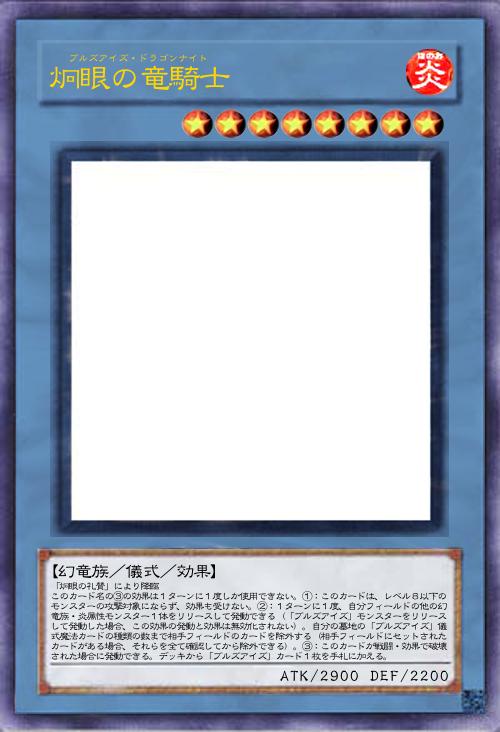 | 「炯眼の礼賛」により降臨 このカード名の③の効果は1ターンに1度しか使用できない。①:このカードは、レベル8以下のモンスターの攻撃対象にならず、効果も受けない。②:1ターンに1度、自分フィールドの他の幻竜族・炎属性モンスター1体をリリースして発動できる(「ブルズアイズ」モンスターをリリースして発動した場合、この効果の発動と効果は無効化されない)。自分の墓地の「ブルズアイズ」儀式魔法カードの種類の数まで相手フィールドのカードを除外する(相手フィールドにセットされたカードがある場合、それらを全て確認してから除外できる)。③:このカードが戦闘・効果で破壊された場合に発動できる。デッキから「ブルズアイズ」カード1枚を手札に加える。 | |||