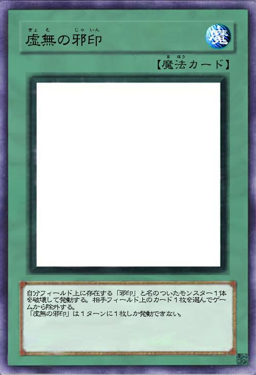 自分フィールド上に存在する「邪印」と名のついたモンスター1体を破壊して発動する。相手フィールド上のカード1枚を選んでゲームから除外する。 「虚無の邪印」は1ターンに1枚しか発動できない。 |
