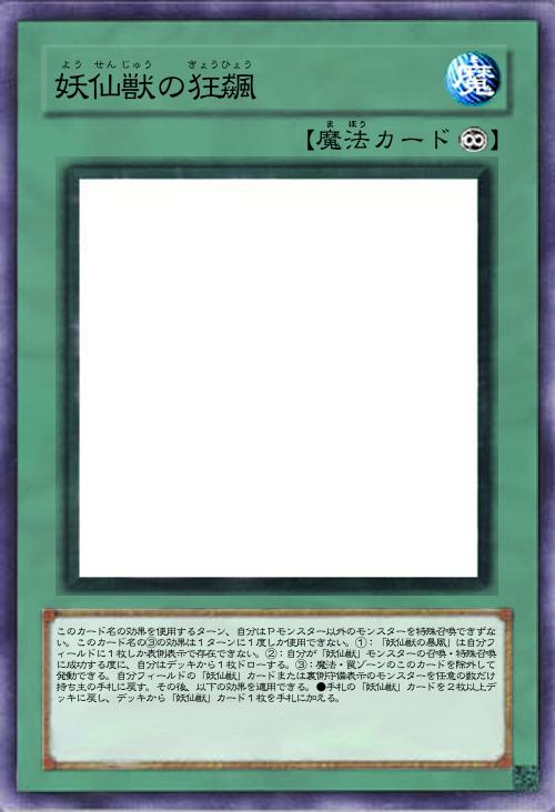 | このカード名の効果を使用するターン、自分はPモンスター以外のモンスターを特殊召喚できずない。このカード名の③の効果は1ターンに1度しか使用できない。①:「妖仙獣の暴風」は自分フィールドに1枚しか表側表示で存在できない。②:自分が「妖仙獣」モンスターの召喚・特殊召喚に成功する度に、自分はデッキから1枚ドローする。③:魔法・罠ゾーンのこのカードを除外して発動できる。自分フィールドの「妖仙獣」カードまたは裏側守備表示のモンスターを任意の数だけ持ち主の手札に戻す。その後、以下の効果を適用できる。●手札の「妖仙獣」カードを2枚以上デッキに戻し、デッキから「妖仙獣」カード1枚を手札に加える。 | |||