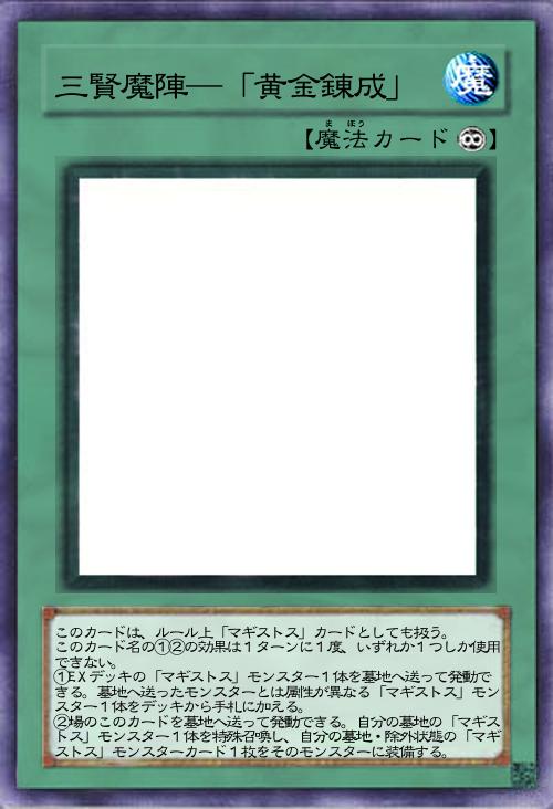 | このカードは、ルール上「マギストス」カードとしても扱う。 このカード名の①②の効果は1ターンに1度、いずれか1つしか使用できない。 ①EXデッキの「マギストス」モンスター1体を墓地へ送って発動できる。墓地へ送ったモンスターとは属性が異なる「マギストス」モンスター1体をデッキから手札に加える。 ②場のこのカードを墓地へ送って発動できる。自分の墓地の「マギストス」モンスター1体を特殊召喚し、自分の墓地・除外状態の「マギストス」モンスターカード1枚をそのモンスターに装備する。 | |||