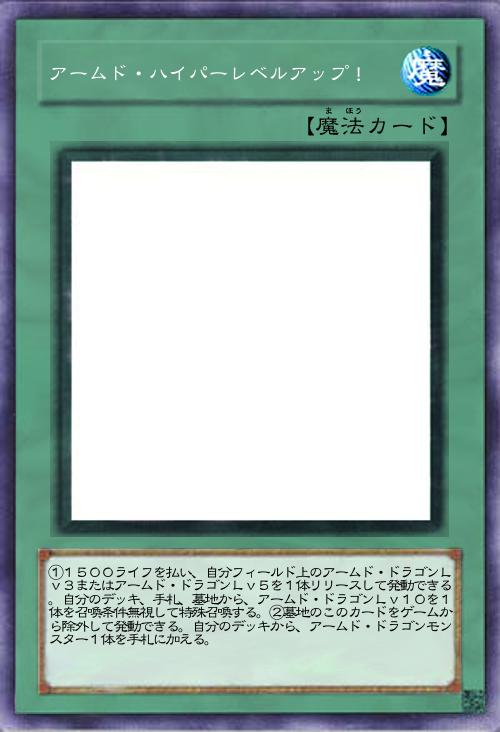 | ①1500ライフを払い、自分フィールド上のアームド・ドラゴンLv3またはアームド・ドラゴンLv5を1体リリースして発動できる。自分のデッキ、手札、墓地から、アームド・ドラゴンLv10を1体を召喚条件無視して特殊召喚する。②墓地のこのカードをゲームから除外して発動できる。自分のデッキから、アームド・ドラゴンモンスター1体を手札に加える。 | |||