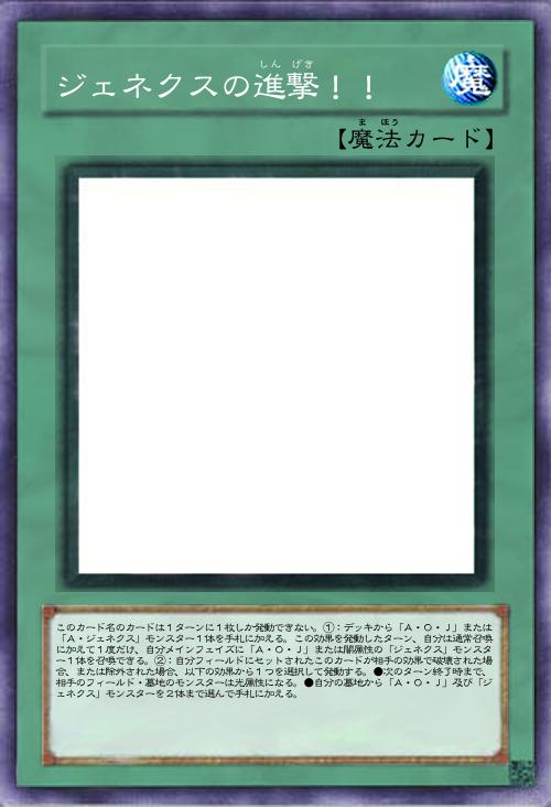 | このカード名のカードは1ターンに1枚しか発動できない。①:デッキから「A・O・J」または「A・ジェネクス」モンスター1体を手札に加える。この効果を発動したターン、自分は通常召喚に加えて1度だけ、自分メインフェイズに「A・O・J」または闇属性の「ジェネクス」モンスター1体を召喚できる。②:自分フィールドにセットされたこのカードが相手の効果で破壊された場合、または除外された場合、以下の効果から1つを選択して発動する。●次のターン終了時まで、相手のフィールド・墓地のモンスターは光属性になる。●自分の墓地から「A・O・J」及び「ジェネクス」モンスターを2体まで選んで手札に加える。 | |||