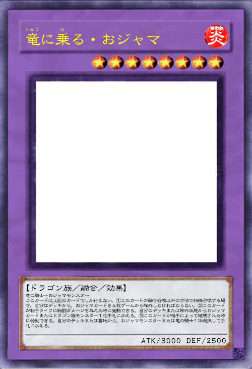 | 竜の騎士+おジャマモンスター このカードは上記のカードでしか行えない。①このカードが融合召喚以外の方法で特殊召喚する場合、自分はデッキから、おジャマカードを4枚ゲームから除外しなければならない。②このカードが相手ライフに戦闘ダメージを与えた時に発動できる。自分のデッキまたは除外状態からおジャマカードまたはドラゴン族モンスター1枚手札に加える。③このカードが相手によって破壊された時に発動できる。自分のデッキまたは墓地から、おジャマモンスターまたは竜の騎士1体選択して手札に加える。 | |||