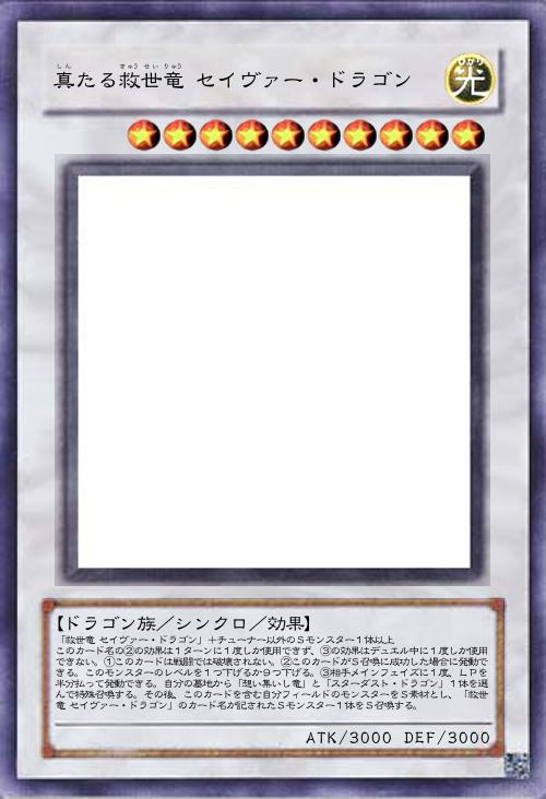 | 「救世竜 セイヴァー・ドラゴン」+チューナー以外のSモンスター1体以上 このカード名の②の効果は1ターンに1度しか使用できず、③の効果はデュエル中に1度しか使用できない。①このカードは戦闘では破壊されない。②このカードがS召喚に成功した場合に発動できる。このモンスターのレベルを1つ下げるか9つ下げる。③相手メインフェイズに1度、LPを半分払って発動できる。自分の墓地から「想い集いし竜」と「スターダスト・ドラゴン」1体を選んで特殊召喚する。その後、このカードを含む自分フィールドのモンスターをS素材とし、「救世竜 セイヴァー・ドラゴン」のカード名が記されたSモンスター1体をS召喚する。 | |||