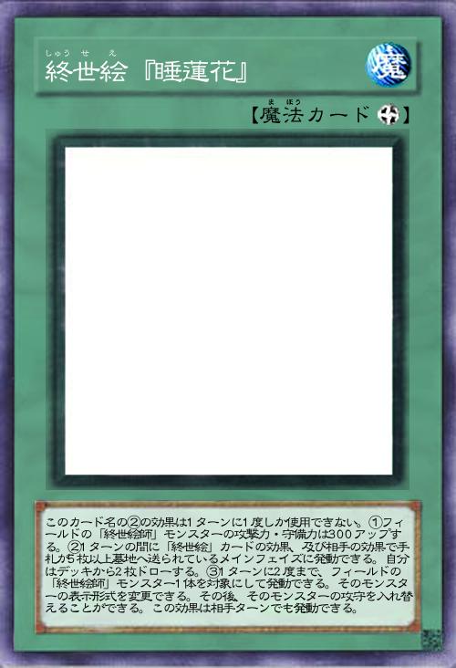 | このカード名の②の効果は1ターンに1度しか使用できない。①フィールドの「終世絵師」モンスターの攻撃力・守備力は300アップする。②1ターンの間に「終世絵」カードの効果、及び相手の効果で手札が5枚以上墓地へ送られているメインフェイズに発動できる。自分はデッキから2枚ドローする。③1ターンに2度まで、フィールドの「終世絵師」モンスター1体を対象にして発動できる。そのモンスターの表示形式を変更できる。その後、そのモンスターの攻守を入れ替えることができる。この効果は相手ターンでも発動できる。 | |||
