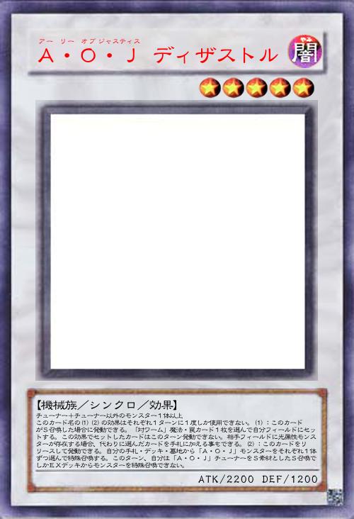 | チューナー+チューナー以外のモンスター1体以上 このカード名の(1)(2)の効果はそれぞれ1ターンに1度しか使用できない。(1):このカードがS召喚した場合に発動できる。「対ワーム」魔法・罠カード1枚を選んで自分フィールドにセットする。この効果でセットしたカードはこのターン発動できない。相手フィールドに光属性モンスターが存在する場合、代わりに選んだカードを手札に加える事もできる。(2):このカードをリリースして発動できる。自分の手札・デッキ・墓地から「A・O・J」モンスターをそれぞれ1体ずつ選んで特殊召喚する。このターン、自分は「A・O・J」チューナーをS素材としたS召喚でしかEXデッキからモンスターを特殊召喚できない。 | |||