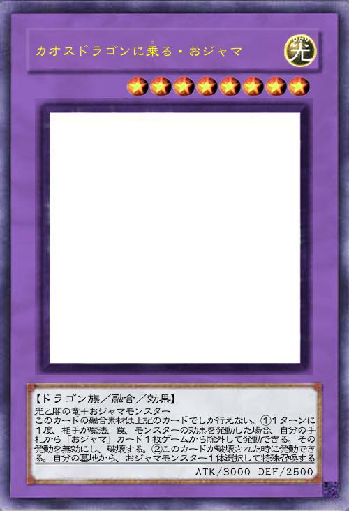 | 光と闇の竜+おジャマモンスター このカードの融合素材は上記のカードでしか行えない。①1ターンに1度、相手が魔法、罠、モンスターの効果を発動した場合、自分の手札から「おジャマ」カード1枚ゲームから除外して発動できる。その発動を無効にし、破壊する。②このカードが破壊された時に発動できる。自分の墓地から、おジャマモンスター1体選択して特殊召喚する | |||