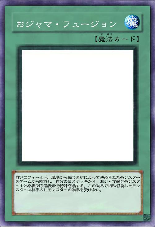 | 自分のフィールド、墓地から融合素材によって決められたモンスターをゲームから除外し、自分のEXデッキから、おジャマ融合モンスター1体を表側守備表示で特殊召喚する。この効果で特殊召喚したモンスターは相手のLモンスターの効果を受けない。 | |||