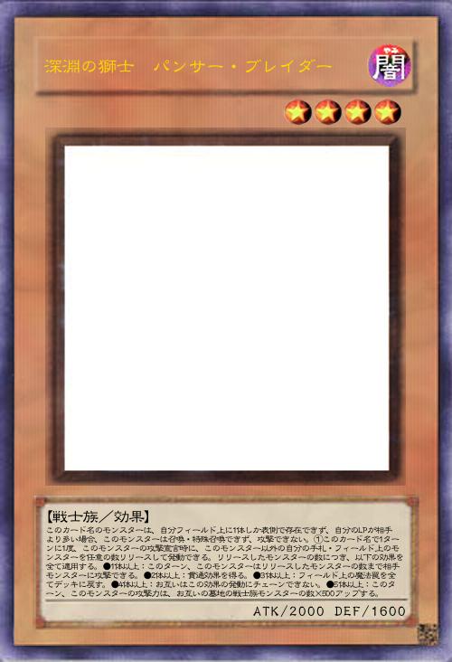 | このカード名のモンスターは、自分フィールド上に1体しか表側で存在できず、自分のLPが相手より多い場合、このモンスターは召喚・特殊召喚できず、攻撃できない。①このカード名で1ターンに1度、このモンスターの攻撃宣言時に、このモンスター以外の自分の手札・フィールド上のモンスターを任意の数リリースして発動できる。リリースしたモンスターの数につき、以下の効果を全て適用する。●1体以上:このターン、このモンスターはリリースしたモンスターの数まで相手モンスターに攻撃できる。●2体以上:貫通効果を得る。●3体以上:フィールド上の魔法罠を全てデッキに戻す。●4体以上:お互いはこの効果の発動にチェーンできない。●5体以上:このターン、このモンスターの攻撃力は、お互いの墓地の戦士族モンスターの数×500アップする。 | |||