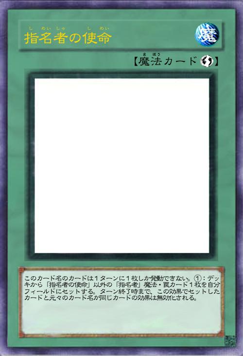 | このカード名のカードは1ターンに1枚しか発動できない。①:デッキから「指名者の使命」以外の「指名者」魔法・罠カード1枚を自分フィールドにセットする。ターン終了時まで、この効果でセットしたカードと元々のカード名が同じカードの効果は無効化される。 | |||