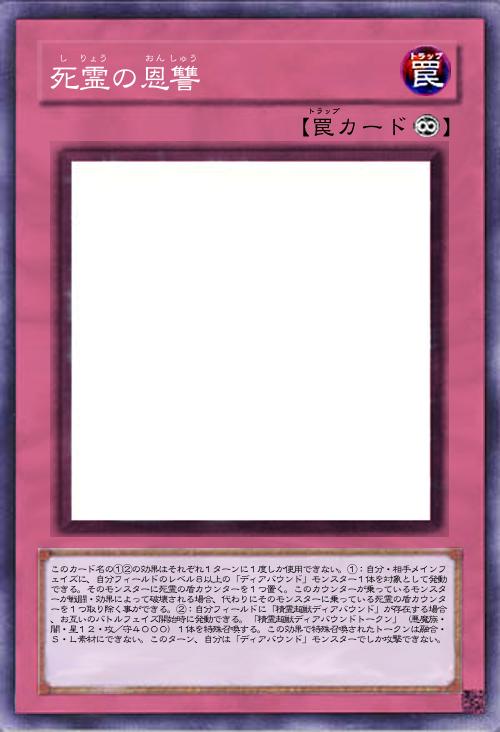 | このカード名の①②の効果はそれぞれ1ターンに1度しか使用できない。①:自分・相手メインフェイズに、自分フィールドのレベル8以上の「ディアバウンド」モンスター1体を対象として発動できる。そのモンスターに死霊の盾カウンターを1つ置く。このカウンターが乗っているモンスターが戦闘・効果によって破壊される場合、代わりにそのモンスターに乗っている死霊の盾カウンターを1つ取り除く事ができる。②:自分フィールドに「精霊超獣ディアバウンド」が存在する場合、お互いのバトルフェイズ開始時に発動できる。「精霊超獣ディアバウンドトークン」(悪魔族・闇・星12・攻/守4000)1体を特殊召喚する。この効果で特殊召喚されたトークンは融合・S・L素材にできない。このターン、自分は「ディアバウンド」モンスターでしか攻撃できない。 | |||
