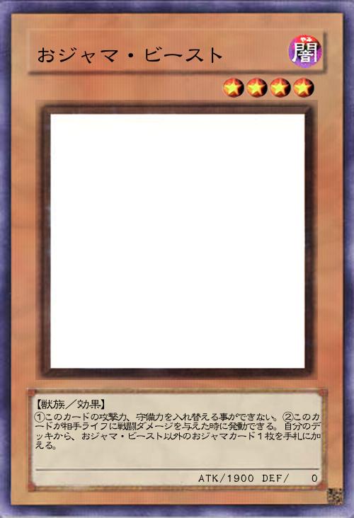 | ①このカードの攻撃力、守備力を入れ替える事ができない。②このカードが相手ライフに戦闘ダメージを与えた時に発動できる。自分のデッキから、おジャマ・ビースト以外のおジャマカード1枚を手札に加える。 | |||