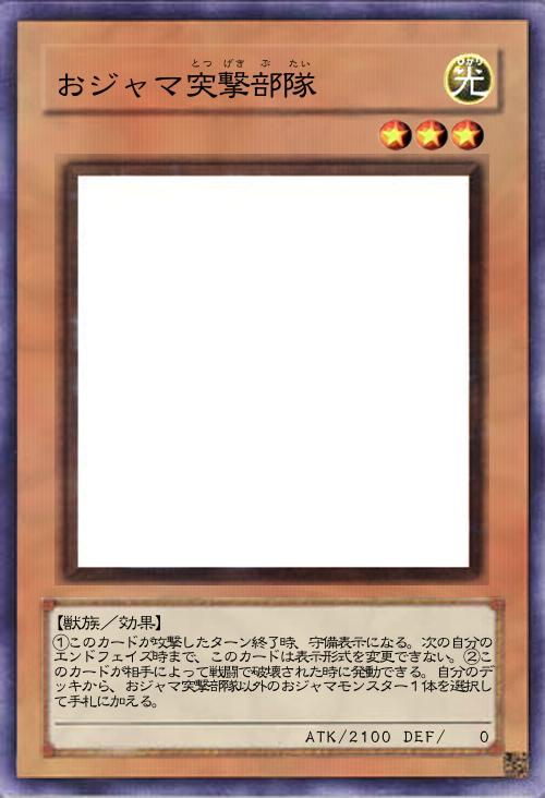 | ①このカードが攻撃したターン終了時、守備表示になる。次の自分のエンドフェイズ時まで、このカードは表示形式を変更できない。②このカードが相手によって戦闘で破壊された時に発動できる。自分のデッキから、おジャマ突撃部隊以外のおジャマモンスター1体を選択して手札に加える。 | |||