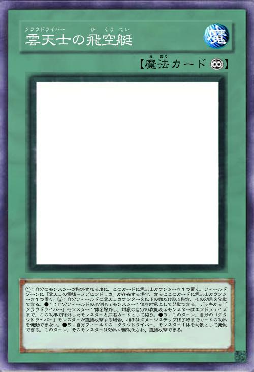 | ①:自分のモンスターが除外される度に、このカードに雲天士カウンターを1つ置く。フィールドゾーンに「雲天士の霊峰-ヌブヒンドゥカ」が存在する場合、さらにこのカードに雲天士カウンターを1つ置く。②:自分フィールドの雲天士カウンターを以下の数だけ取り除き、その効果を発動できる。●1:自分フィールドの表側表示モンスター1体を対象として発動できる。デッキから「クラウドライバー」モンスター1体を除外し、対象の自分の表側表示モンスターはエンドフェイズまで、この効果で除外したモンスターと同名カードとして扱う。●3:このターン、自分の「クラウドライバー」モンスターが直接攻撃する場合、相手はダメージステップ終了時までカードの効果を発動できない。●5:自分フィールドの「クラウドライバー」モンスター1体を対象として発動できる。このターン、そのモンスターは効果が無効化され、直接攻撃できる。 | |||