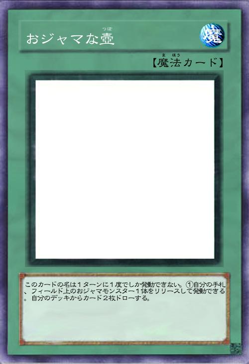 | このカードの名は1ターンに1度でしか発動できない。①自分の手札、フィールド上のおジャマモンスター1体をリリースして発動できる。自分のデッキからカード2枚ドローする。 | |||