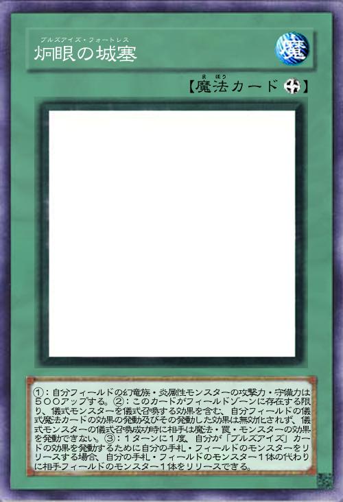 | ①:自分フィールドの幻竜族・炎属性モンスターの攻撃力・守備力は500アップする。②:このカードがフィールドゾーンに存在する限り、儀式モンスターを儀式召喚する効果を含む、自分フィールドの儀式魔法カードの効果の発動及びその発動した効果は無効化されず、儀式モンスターの儀式召喚成功時に相手は魔法・罠・モンスターの効果を発動できない。③:1ターンに1度、自分が「ブルズアイズ」カードの効果を発動するために自分の手札・フィールドのモンスターをリリースする場合、自分の手札・フィールドのモンスター1体の代わりに相手フィールドのモンスター1体をリリースできる。 | |||