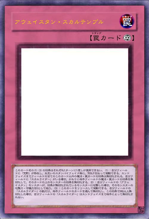 | このカード名の(1)(3)の効果はそれぞれ1ターンに1度しか使用できない。(1):自分フィールドに「荒野」が存在し、お互いのスタンバイフェイズ毎に、700LPを払って発動できる。エンドフェイズまでフィールドの全てのこのカード以外の魔法・罠カードの効果は無効化される。自分フィールドに「スカルライダー」がいる場合、かわりに相手フィールドの魔法・罠カードの効果を無効化して、そのカードの上のモンスターの効果を無効化する。(2):自分フィールドの「アウェイスタン」モンスターが、効果が無効化されているモンスターに攻撃した場合、そのモンスターの攻撃力・守備力を0として扱う。(3):このカードをリリースして発動できる。自分フィールドの「スカルライダー」の数だけ、相手フィールドのカードを選んで無効化し、この効果で3枚以上無効化した場合、自分フィールドの「スカルライダー」はエンドフェイズまで相手によって無効化されない。 | |||