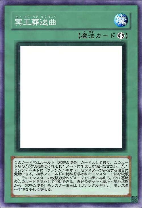 | このカード名はルール上「冥府の使者」カードとして扱う。このカード名の①②の効果はそれぞれ1ターンに1度しか使用できない。①:自分フィールドに「ヴァンダルギオン」モンスターが存在する場合に発動できる。相手フィールドの特殊召喚されたモンスター1体を破壊し、そのモンスターの攻撃力分のダメージを相手に与える。②:墓地のこのカードを除外して発動できる。自分のデッキ・墓地・除外状態から「冥府の使者」モンスターまたは「ヴァンダルギオン」モンスター1体を手札に加える。 | |||