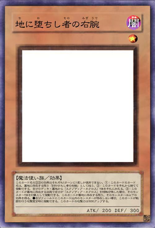 | このカード名の②③の効果はそれぞれ1ターンに1度しか使用できない。①:このカードのカード名は、墓地に存在する限り「封印されし者の右腕」として扱う。②:このカードを手札から捨てて発動できる。自分のデッキ・墓地から「エクゾディア・ネクロス」1体を手札に加える。③:このカードが墓地に存在する状態で自分が「エクゾディア・ネクロス」を特殊召喚した場合、そのモンスター1体を対象として発動できる。このカードが墓地に存在する限り、そのモンスターは以下の効果を得る。●自分フィールドにこのカード以外のモンスターが存在しない場合、このカードが戦闘を行う攻撃宣言時に発動できる。このカードの攻撃力は1000アップする。 | |||