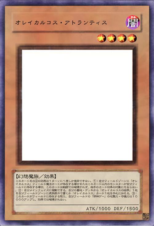| このカード名の②の効果は1ターンに1度しか使用できない。①:自分フィールドゾーンに「オレイカルコス」フィールド魔法カードが存在する場合またはこのカード以外のモンスターが自分フィールドに存在する場合、このカードは戦闘では破壊されず、相手のカード効果の対象にもならない。②:自分メインフェイズに発動できる。自分の墓地・デッキから「オレイカルコスの結界」1枚を自分フィールドゾーンに表側表示で置くか「オレイカルコス」カード1枚を手札に加える。③:このカードがフィールドに存在する限り、自分フィールドの「邪神ゲー」の攻撃力・守備力は10000アップし、効果では破壊されない。 | |||
