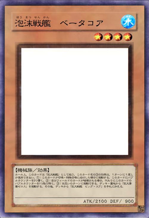 「「巨大戦艦」の強化カードです。5期時点ではカテゴリ化されていたかどうか怪しいですが、最初の巨大戦艦であるビッグ・コアがカード化済みだったはずなのでお許しいただきたい。「巨大戦艦」の弱点であるフィールド魔法や永続魔法を守ることを前提に作りました。本モンスターはゲーム「ネメシス’90改」にて登場した詳細不明のビッグ・コア似の機体をモチーフとしており、泡で自らを守る戦い方をしてくるため強固な破壊耐性持ちにいたしました。」(2023-12-25 17:28)