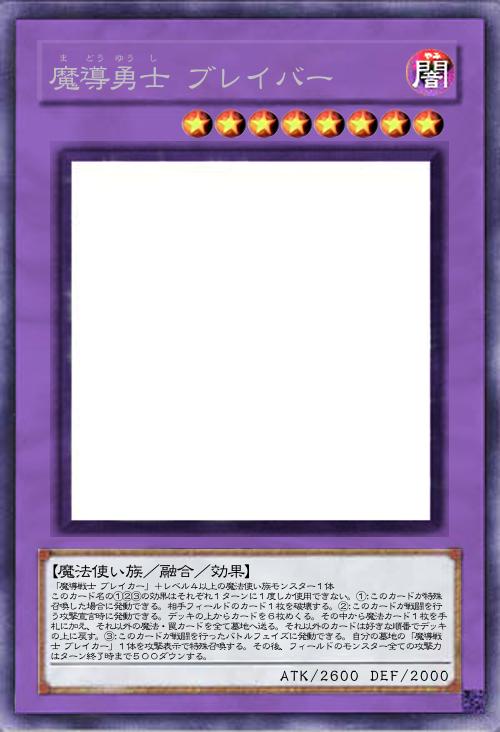 | 「魔導戦士 ブレイカー」+レベル4以上の魔法使い族モンスター1体 このカード名の①②③の効果はそれぞれ1ターンに1度しか使用できない。①:このカードが特殊召喚した場合に発動できる。相手フィールドのカード1枚を破壊する。②:このカードが戦闘を行う攻撃宣言時に発動できる。デッキの上からカードを6枚めくる。その中から魔法カード1枚を手札に加え、それ以外の魔法・罠カードを全て墓地へ送る。それ以外のカードは好きな順番でデッキの上に戻す。③:このカードが戦闘を行ったバトルフェイズに発動できる。自分の墓地の「魔導戦士 ブレイカー」1体を攻撃表示で特殊召喚する。その後、フィールドのモンスター全ての攻撃力はターン終了時まで500ダウンする。 | |||