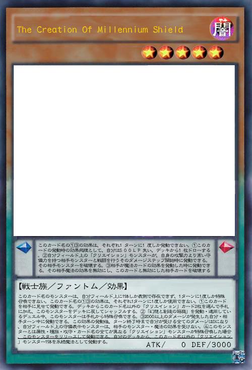 | このカード名のモンスターは、自分フィールド上に1体しか表側で存在できず、1ターンに1度しか特殊召喚できない。このカード名の①③の効果は、それぞれ1ターンに1度しか使用できない。①このカードを相手に見せて発動できる。デッキからこのカード名以外の「クリエイション」カード2枚を選んで手札に加え、このモンスターをデッキに戻してシャッフルする。②「幻想と創造の箱庭」を発動・適用しているデュエル中、このモンスターは手札から特殊召喚できる。③2000以上のダメージが発生した自分・相手ターン中に発動できる。この効果の発動後、ターン終了時まで自分が受ける全てのダメージは0になり、自分フィールド上の守備表示モンスターは、相手のモンスター・魔法の効果を受けない。④このモンスターとは属性・種族・攻守・カード名の全てが異なる「クリエイション」モンスターが特殊召喚した場合、このモンスターをリリースして発動できる。自分のデッキから、このカード名以外の「クリエイション」モンスター1体を永続魔法として発動する。 | |||