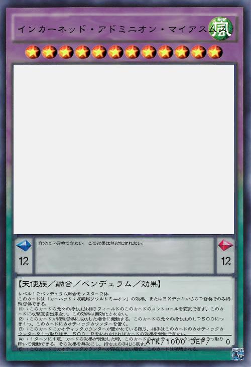 | レベル12ペンデュラム融合モンスター2体 このカードは「カーネッド:反魂域ソウルドミニオン」の効果、またはEXデッキからのP召喚でのみ特殊召喚できる。 (1):このカードの元々の持ち主は相手フィールドのこのカードのコントロールを変更できず、このカードに攻撃宣言出来ない。この効果は無効化されない。 (2):このカードが特殊召喚に成功した場合に発動する。このカードの元々の持ち主のLP500につき1つ、このカードにカオティックカウンターを置く。 (3):このカードにカオティックカウンターが置かれている限り、相手はこのカードのカオティックカウンターを1つ取り除き、500LPを払わなければカードの効果を発動できない。 (4):1ターンに1度、カードの効果が発動した時、このカードのカオティックカウンターを3つ取り除いて発動できる。その効果を無効にし、持ち主の手札に戻す。 (5):このカードにカオティックカウンターが存在しない場合、このカードは破壊される。 | |||