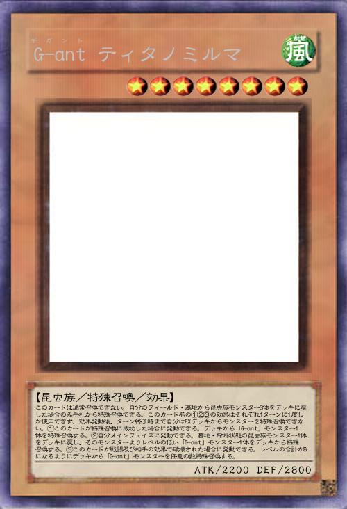 | このカードは通常召喚できない。自分のフィールド・墓地から昆虫族モンスター3体をデッキに戻した場合のみ手札から特殊召喚できる。このカード名の①②③の効果はそれぞれ1ターンに1度しか使用できず、効果発動後、ターン終了時まで自分はEXデッキからモンスターを特殊召喚できない。①このカードが特殊召喚に成功した場合に発動できる。デッキから「G-ant」モンスター1体を特殊召喚する。②自分メインフェイズに発動できる。墓地・除外状態の昆虫族モンスター1体をデッキに戻し、そのモンスターよりレベルの低い「G-ant」モンスター1体をデッキから特殊召喚する。③このカードが戦闘及び相手の効果で破壊された場合に発動できる。レベルの合計が8になるようにデッキから「G-ant」モンスターを任意の数特殊召喚する。 | |||