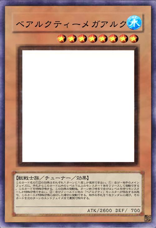 | このカード名の①②の効果はそれぞれ1ターンに1度しか使用できない。①:自分・相手のメインフェイズに、手札からこのカード以外のレベル7以上のモンスター1体をリリースして発動できる。このカードを特殊召喚する。この効果の発動後、ターン終了時まで自分はレベルを持つモンスターしか特殊召喚できない。②:自分フィールドに他の「ベアルクティ」モンスターが存在する状態で、このカードが特殊召喚に成功した場合に発動できる。相手の手札を1枚ランダムに選び、そのカードを次のターンのエンドフェイズまで裏側で除外する。 | |||
