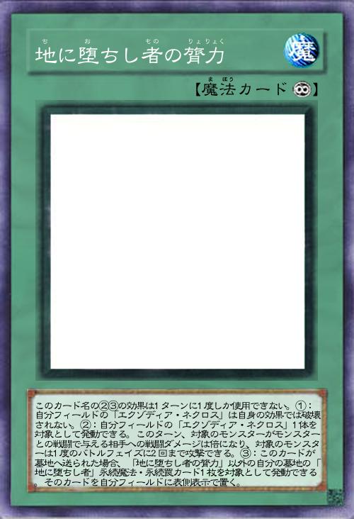 | このカード名の②③の効果は1ターンに1度しか使用できない。①:自分フィールドの「エクゾディア・ネクロス」は自身の効果では破壊されない。②:自分フィールドの「エクゾディア・ネクロス」1体を対象として発動できる。このターン、対象のモンスターがモンスターとの戦闘で与える相手への戦闘ダメージは倍になり、対象のモンスターは1度のバトルフェイズに2回まで攻撃できる。③:このカードが墓地へ送られた場合、「地に堕ちし者の膂力」以外の自分の墓地の「地に堕ちし者」永続魔法・永続罠カード1枚を対象として発動できる。そのカードを自分フィールドに表側表示で置く。 | |||