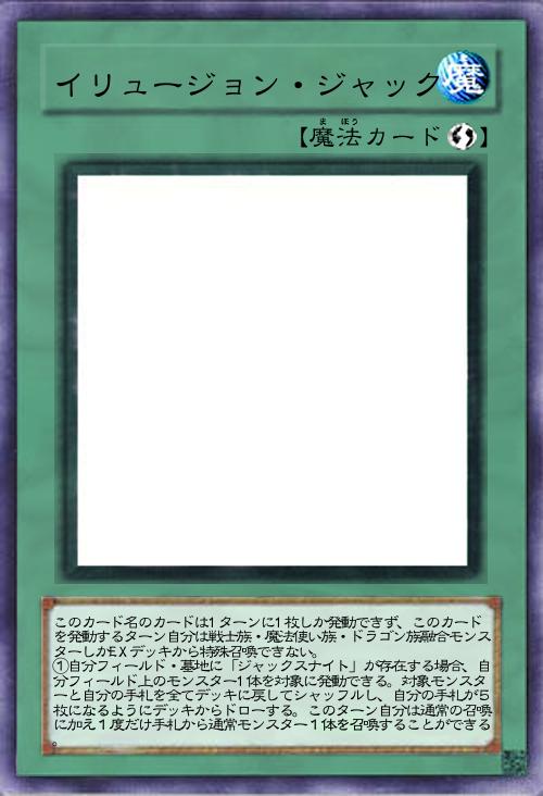 | このカード名のカードは1ターンに1枚しか発動できず、このカードを発動するターン自分は戦士族・魔法使い族・ドラゴン族融合モンスターしかEXデッキから特殊召喚できない。 ①自分フィールド・墓地に「ジャックスナイト」が存在する場合、自分フィールド上のモンスター1体を対象に発動できる。対象モンスターと自分の手札を全てデッキに戻してシャッフルし、自分の手札が5枚になるようにデッキからドローする。このターン自分は通常の召喚に加え1度だけ手札から通常モンスター1体を召喚することができる。 | |||