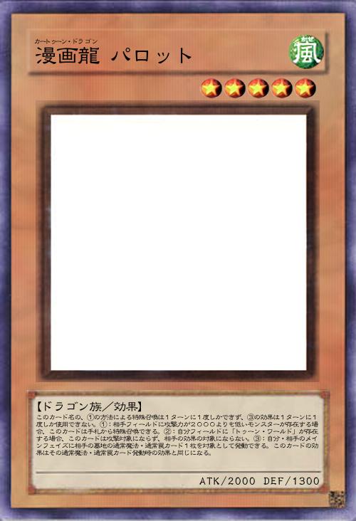 | このカード名の、①の方法による特殊召喚は1ターンに1度しかできず、③の効果は1ターンに1度しか使用できない。①:相手フィールドに攻撃力が2000よりも低いモンスターが存在する場合、このカードは手札から特殊召喚できる。②:自分フィールドに「トゥーン・ワールド」が存在する場合、このカードは攻撃対象にならず、相手の効果の対象にならない。③:自分・相手のメインフェイズに相手の墓地の通常魔法・通常罠カード1枚を対象として発動できる。このカードの効果はその通常魔法・通常罠カード発動時の効果と同じになる。 | |||