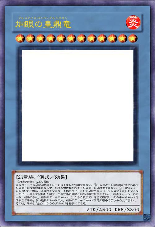 | 「炯眼の供犠」により降臨 このカード名の②の効果は1ターンに1度しか使用できない。①:このカードは特殊召喚されたモンスターの攻撃対象にならず、特殊召喚された相手モンスターの効果も受けない。②:自分フィールドの他の幻竜族・炎属性モンスター1体をリリースして発動できる(「ブルズアイズ」モンスターをリリースして発動した場合、この効果の発動と効果は無効化されない)。相手フィールドのカード、相手の手札、相手のデッキのカード(上から5枚まで)を全て確認し、その中からカードを3枚まで除外する(残りのカードの内、相手のデッキのカードは元の順番でデッキの上に戻す)。その後、除外した数×1000ダメージを相手に与える。 | |||