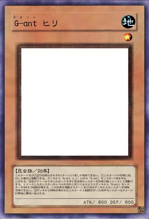 | このカード名の①②の効果はそれぞれ1ターンに1度しか使用できない。①このカードが召喚に成功した場合に発動できる。デッキから「G-ant ヒリ」以外の「G-ant」モンスター1体を手札に加える。②自分フィールドのこのカードを含む昆虫族モンスターを任意の数リリースして発動できる。リリースしたモンスターのレベルの合計と同じになるようにデッキから「G-ant」モンスターを3体まで特殊召喚する。この効果を発動するターン自分はEXデッキからモンスターを特殊召喚できない。③デッキから特殊召喚されたこのカードと戦闘を行った相手モンスターはダメージ計算後に墓地へ送られる。 | |||