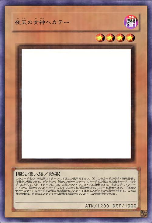 | このカード名の①の効果は1ターンに1度しか使用できない。①:このカードが召喚・特殊召喚した場合に発動できる。デッキから「夜天の女神ヘカテー」のカード名が記された魔法カード1枚を手札に加える。②:1ターンに1度、お互いのメインフェイズに発動できる。自分の手札・フィールドから、融合モンスターカードによって決められた融合素材モンスターを墓地へ送り、「夜天の女神ヘカテー」のカード名が記された融合モンスター1体をEXデッキから融合召喚する。この効果の発動後、自分はEXデッキから闇属性の融合モンスターしか特殊召喚できない。 | |||
