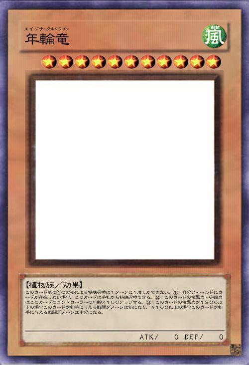 | このカード名の①の方法による特殊召喚は1ターンに1度しかできない。①:自分フィールドにカードが存在しない場合、このカードは手札から特殊召喚できる。②:このカードの攻撃力・守備力はこのカードのコントローラーの年齢×100アップする。③:このカードの攻撃力が1900以下の場合このカードが相手に与える戦闘ダメージは倍になり、4100以上の場合このカードが相手に与える戦闘ダメージは半分になる。 | |||