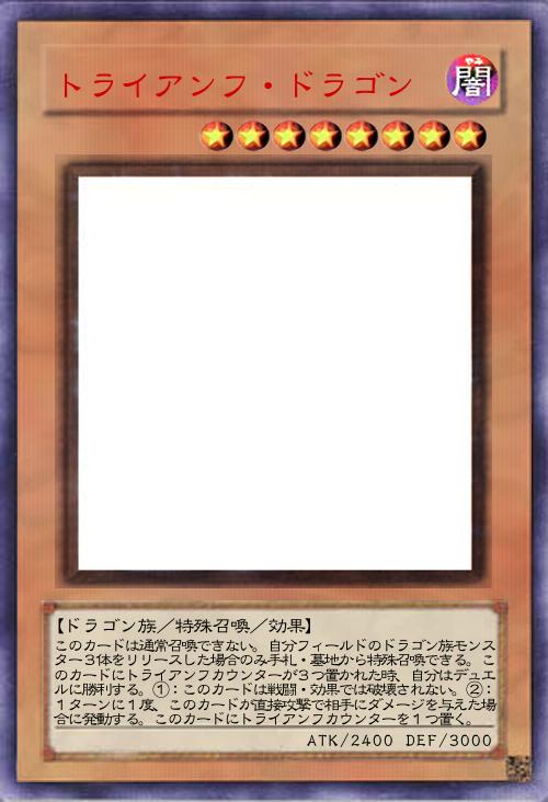 | このカードは通常召喚できない。自分フィールドのドラゴン族モンスター3体をリリースした場合のみ手札・墓地から特殊召喚できる。このカードにトライアンフカウンターが3つ置かれた時、自分はデュエルに勝利する。①:このカードは戦闘・効果では破壊されない。②:1ターンに1度、このカードが直接攻撃で相手にダメージを与えた場合に発動する。このカードにトライアンフカウンターを1つ置く。 | |||