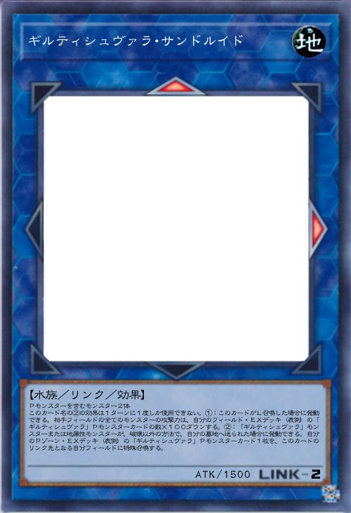 | Pモンスターを含むモンスター2体 このカード名の②の効果は1ターンに1度しか使用できない。①:このカードがL召喚した場合に発動できる。相手フィールドの全てのモンスターの攻撃力は、自分のフィールド・EXデッキ(表側)の「ギルティシュヴァラ」Pモンスターカードの数×100ダウンする。②:「ギルティシュヴァラ」モンスターまたは地属性モンスターが、破壊以外の方法で、自分の墓地へ送られた場合に発動できる。自分のPゾーン・EXデッキ(表側)の「ギルティシュヴァラ」Pモンスターカード1枚を、このカードのリンク先となる自分フィールドに特殊召喚する。 | |||
