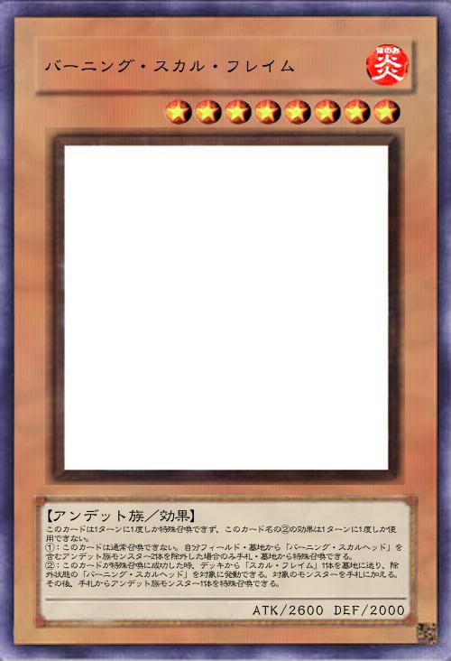 | このカードは1ターンに1度しか特殊召喚できず、このカード名の②の効果は1ターンに1度しか使用できない。 ①:このカードは通常召喚できない。自分フィールド・墓地から「バーニング・スカルヘッド」を含むアンデット族モンスター2体を除外した場合のみ手札・墓地から特殊召喚できる。 ②:このカードが特殊召喚に成功した時、デッキから「スカル・フレイム」1体を墓地に送り、除外状態の「バーニング・スカルヘッド」を対象に発動できる。対象のモンスターを手札に加える。その後、手札からアンデット族モンスター1体を特殊召喚できる。 | |||