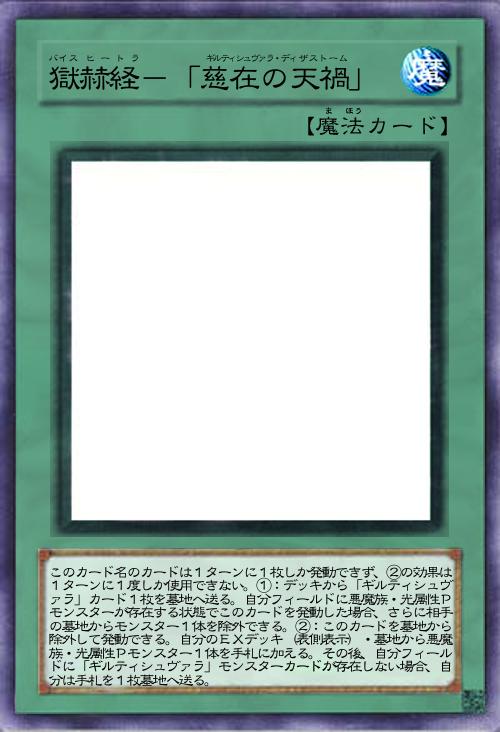 | このカード名のカードは1ターンに1枚しか発動できず、②の効果は1ターンに1度しか使用できない。①:デッキから「ギルティシュヴァラ」カード1枚を墓地へ送る。自分フィールドに悪魔族・光属性Pモンスターが存在する状態でこのカードを発動した場合、さらに相手の墓地からモンスター1体を除外できる。②:このカードを墓地から除外して発動できる。自分のEXデッキ(表側表示)・墓地から悪魔族・光属性Pモンスター1体を手札に加える。その後、自分フィールドに「ギルティシュヴァラ」モンスターカードが存在しない場合、自分は手札を1枚墓地へ送る。 | |||