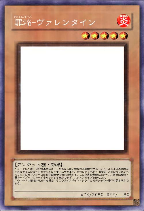 1ターンに1度、自分の墓地にカードが存在しない場合のみ発動できる。フィールド上に表側表示で存在するこのカードをデッキの一番下に戻す事で、自分のデッキから「罪焔」と名のついたレベル3以下のモンスター2体を守備表示で特殊召喚する。この効果を発動したターン、自分は魔法・罠カードゾーンにカードをセットする事ができず、バトルフェイズを行えない。 このカードは墓地へ送られた場合、800ライフポイント払うことでデッキの一番下に戻す事ができる。 |