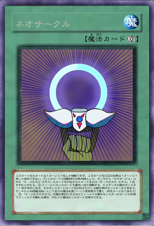 | このカード名のカードは1ターンに1枚しか発動できず、このカード名の②の効果は1ターンに1度しか使用できない。①:このカードの発動時の効果処理として、デッキから「ネオサークル」以外の「E・HERO ネオス」のカード名が記されたカードまたは「E・HERO ネオス」1枚を手札に加える。②:フィールドのこのカードを墓地へ送り発動する。EXデッキの融合モンスター1体を相手に見せ、そのモンスターにカード名が記されている融合素材モンスターを2体まで、デッキから永続魔法扱いとして自分の魔法&罠ゾーンに表側表示で置く(同名カードは1体まで)。③:「E・HEROネオス」を融合素材とする自分フィールドの融合モンスターがカードの効果でフィールドを離れる場合、代わりに墓地のこのカードを除外できる。 | |||
