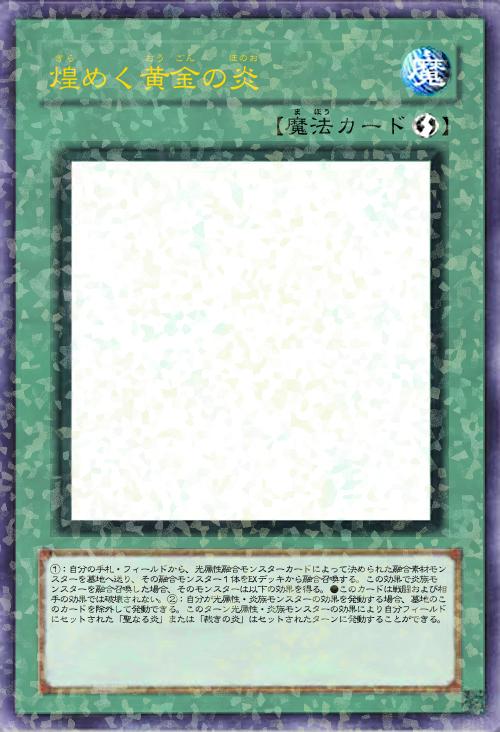| ①:自分の手札・フィールドから、光属性融合モンスターカードによって決められた融合素材モンスターを墓地へ送り、その融合モンスター1体をEXデッキから融合召喚する。この効果で炎族モンスターを融合召喚した場合、そのモンスターは以下の効果を得る。●このカードは戦闘および相手の効果では破壊されない。②:自分が光属性・炎族モンスターの効果を発動する場合、墓地のこのカードを除外して発動できる。このターン光属性・炎族モンスターの効果により自分フィールドにセットされた「聖なる炎」または「裁きの炎」はセットされたターンに発動することができる。 | |||