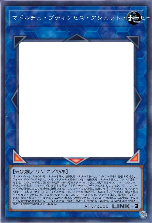 | 「マドルチェ」以外のLモンスターを除く地属性モンスター1体以上 このカードをL召喚する場合、フィールドの「マドルチェ」XモンスターのX素材1つを、地属性モンスター1体としてリンク素材にできる。このカード名の(2)(3)の効果はそれぞれ1ターンに1度しか使用できない。(1):このカードのカード名は、フィールドに存在する限り「マドルチェ・プディンセス」として扱う。(2):このカードがL召喚に成功した場合に発動できる。このカードのL召喚に使用した「マドルチェ」モンスターの数-1枚まで、デッキから「マドルチェ」モンスターを特殊召喚、または「マドルチェ」魔法・罠カードをセットできる。(3):お互いのターンに1度、フィールドのモンスター1体か、墓地の「マドルチェ」魔法・罠カード1枚のどちらかを対象として発動できる。モンスターを対象とした場合、そのカードの表示形式を変更する。「マドルチェ」魔法・罠カードを対象とした場合、この効果はその魔法・罠カード発動時の効果と同じになる。 | |||