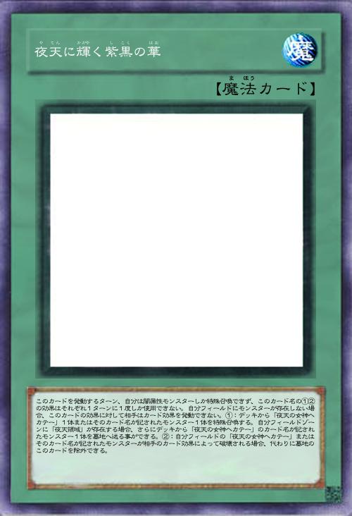| このカードを発動するターン、自分は闇属性モンスターしか特殊召喚できず、このカード名の①②の効果はそれぞれ1ターンに1度しか使用できない。自分フィールドにモンスターが存在しない場合、このカードの効果に対して相手はカード効果を発動できない。①:デッキから「夜天の女神ヘカテー」1体またはそのカード名が記されたモンスター1体を特殊召喚する。自分フィールドゾーンに「夜天領域」が存在する場合、さらにデッキから「夜天の女神ヘカテー」のカード名が記されたモンスター1体を墓地へ送る事ができる。②:自分フィールドの「夜天の女神ヘカテー」またはそのカード名が記されたモンスターが相手のカード効果によって破壊される場合、代わりに墓地のこのカードを除外できる。 | |||