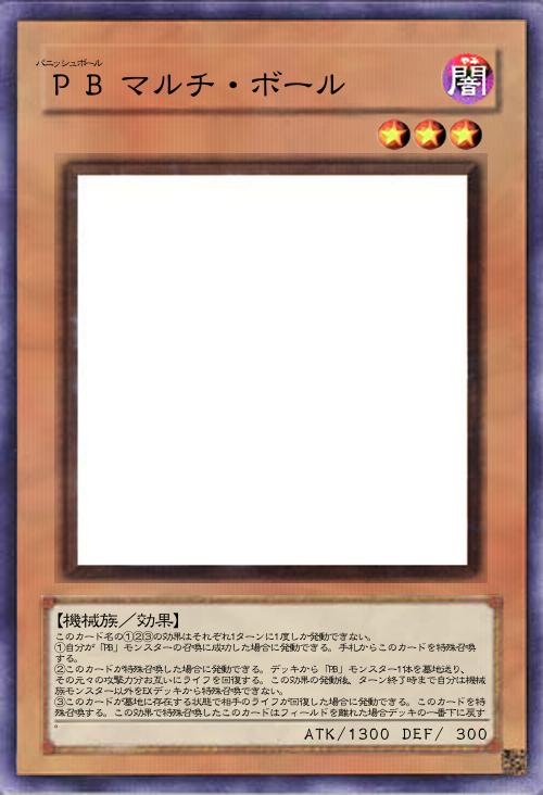 | このカード名の①②③の効果はそれぞれ1ターンに1度しか発動できない。 ①自分が「PB」モンスターの召喚に成功した場合に発動できる。手札からこのカードを特殊召喚する。 ②このカードが特殊召喚した場合に発動できる。デッキから「PB」モンスター1体を墓地送り、その元々の攻撃力分お互いにライフを回復する。この効果の発動後、ターン終了時まで自分は機械族モンスター以外をEXデッキから特殊召喚できない。 ③このカードが墓地に存在する状態で相手のライフが回復した場合に発動できる。このカードを特殊召喚する。この効果で特殊召喚したこのカードはフィールドを離れた場合デッキの一番下に戻す。 | |||